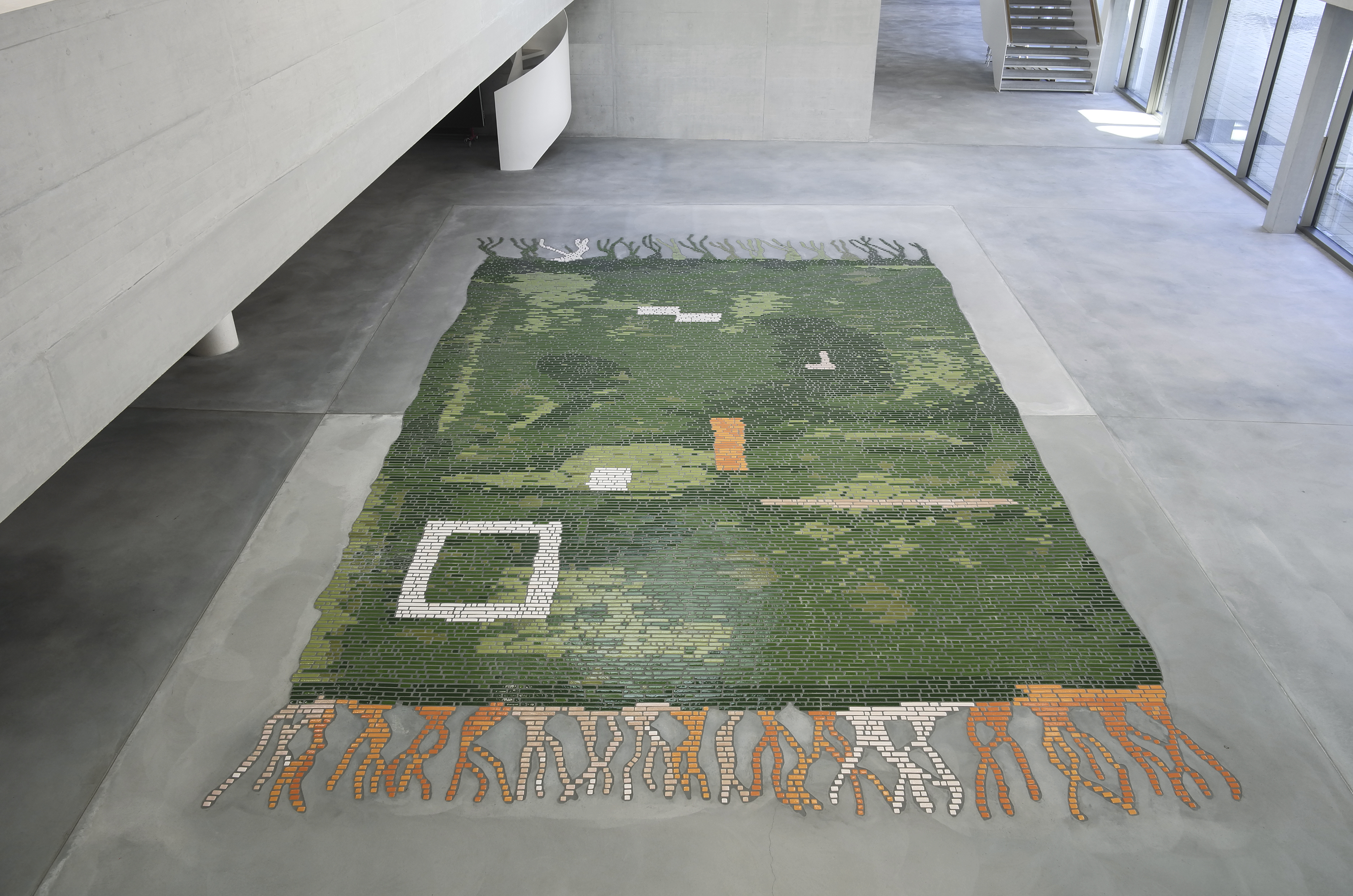 This ceramic rug by Claudia & Julia Müller transforms a school hall through material deception. At first glance, it appears to be a soft, woven carpet with long fringes, but it is actually a permanent installation of glazed ceramic tiles set into the concrete floor. The work cleverly plays with domestic comfort and institutional space, using the familiar object of a rug to alter the perception of a vast, functional hallway. Its title, a direct quote from the film The Big Lebowski, injects a layer of pop culture wit, suggesting how an ordinary item can unexpectedly define an environment. By being laid slightly off-axis, the rug creates a subtle tension and reorients the flow of the space without obstructing it. The handmade quality of the tiles, in ten different colors, adds a tactile, artisanal warmth to the hard architectural setting, making the school's common area feel both anchored and strangely inviting.